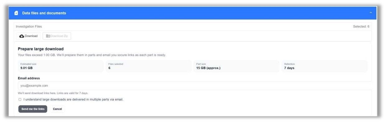 - Check the box to confirm: “I understand large downloads are delivered in multiple parts via email.”